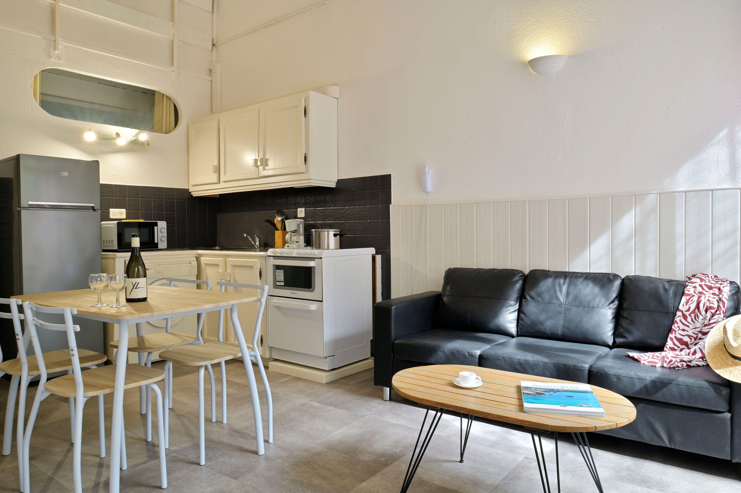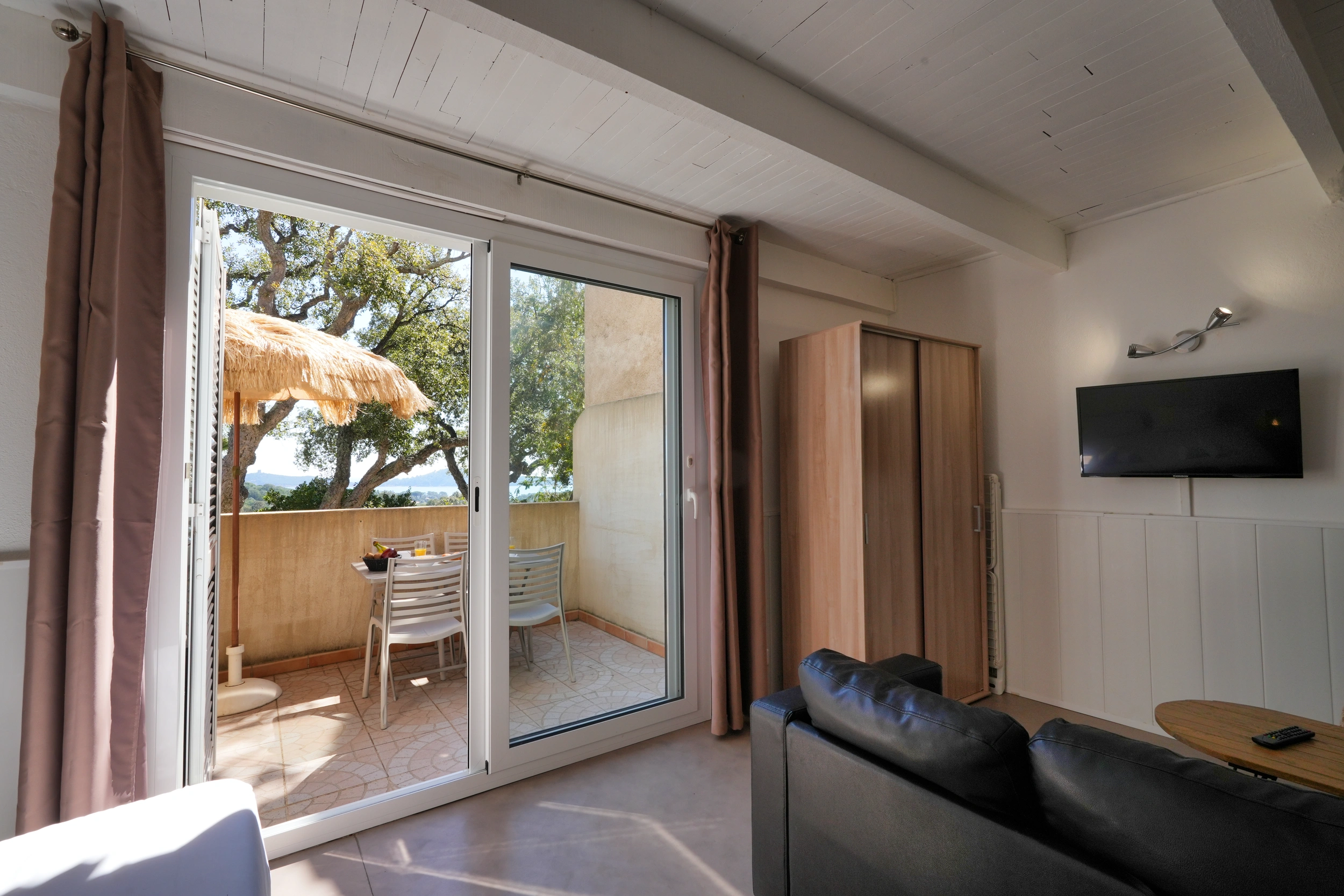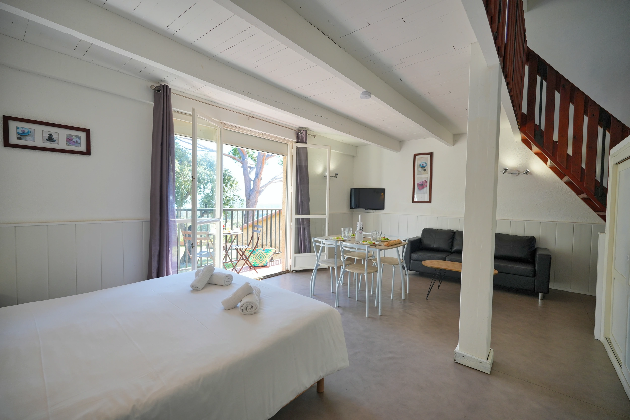Conçu pour accueillir jusqu’à 4 personnes, le studio « Mezzanine » séduit par son agencement astucieux. À la pièce principale (1 lit 160 ou deux lits 90) s’ajoute une mezzanine aménagée (1 lit 160 ou 2 lits 90), idéale pour deux couchages supplémentaires. Avec ses 30 m² environ, il allie convivialité et confort. Parfait pour les familles ou les petits groupes, il est équipé d’une cuisine complète, climatisation, télévision, wifi et coffre-fort. Terrasse ou balcon selon le niveau, certains offrant une vue sur la mer.
