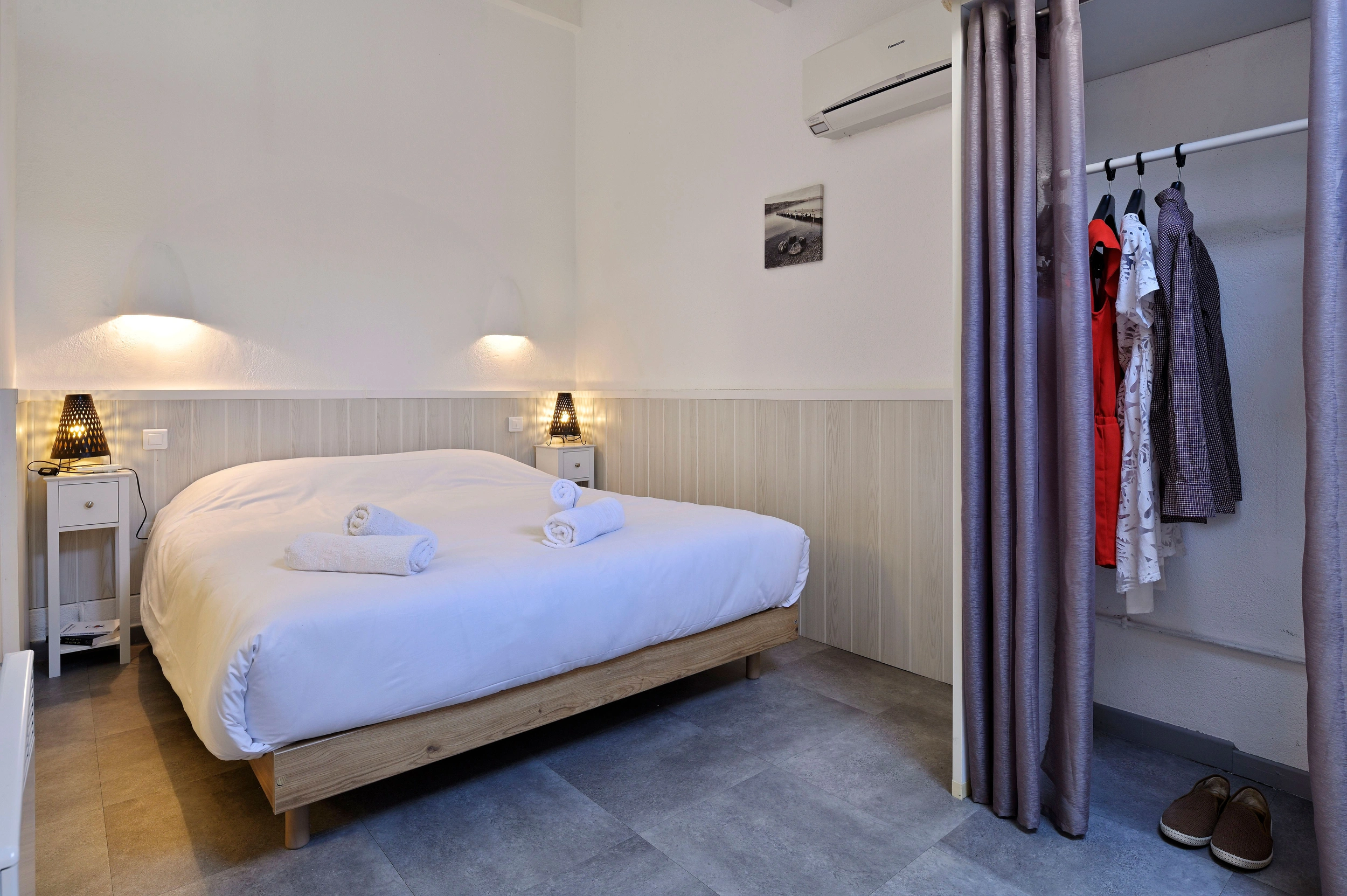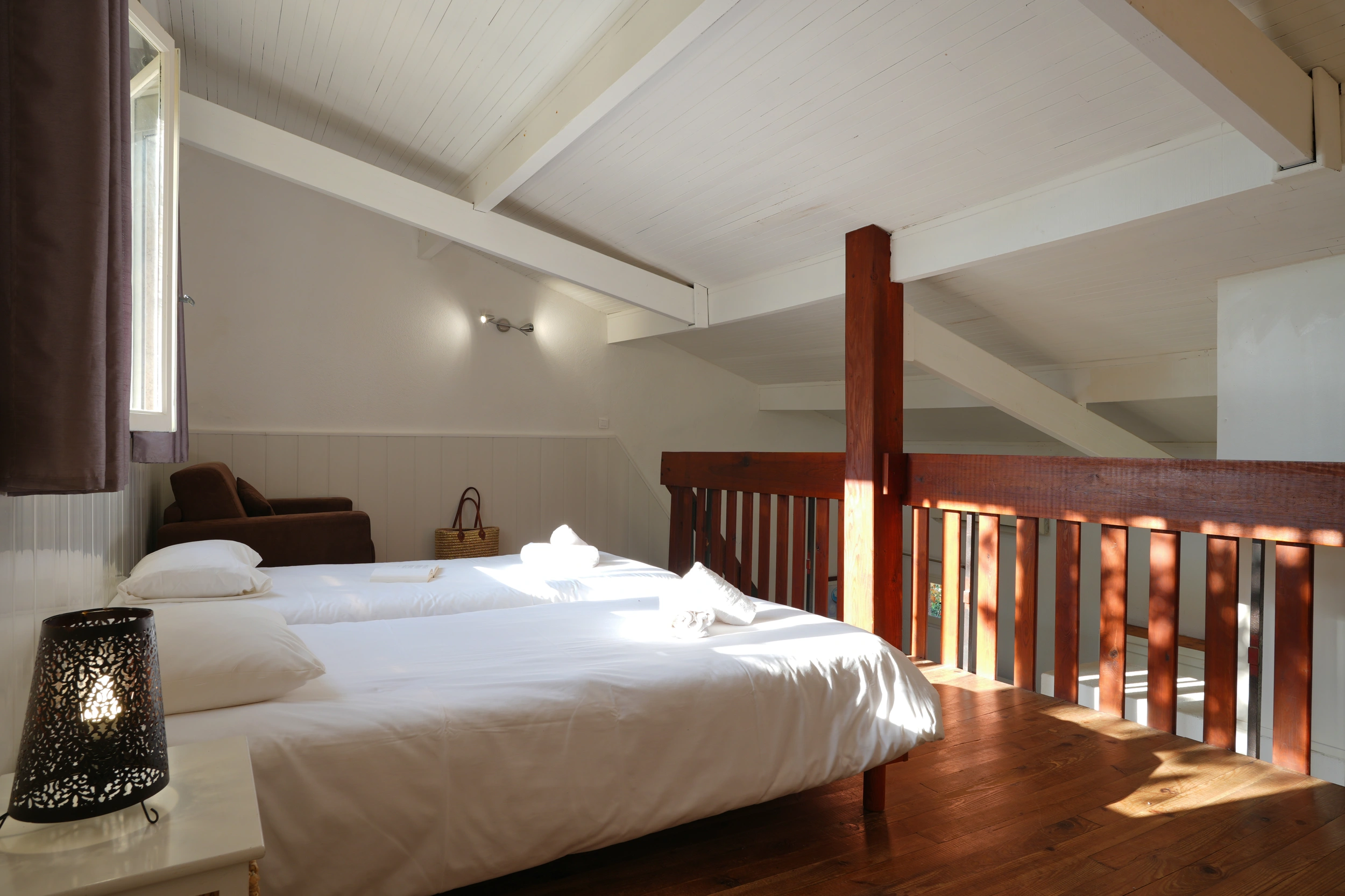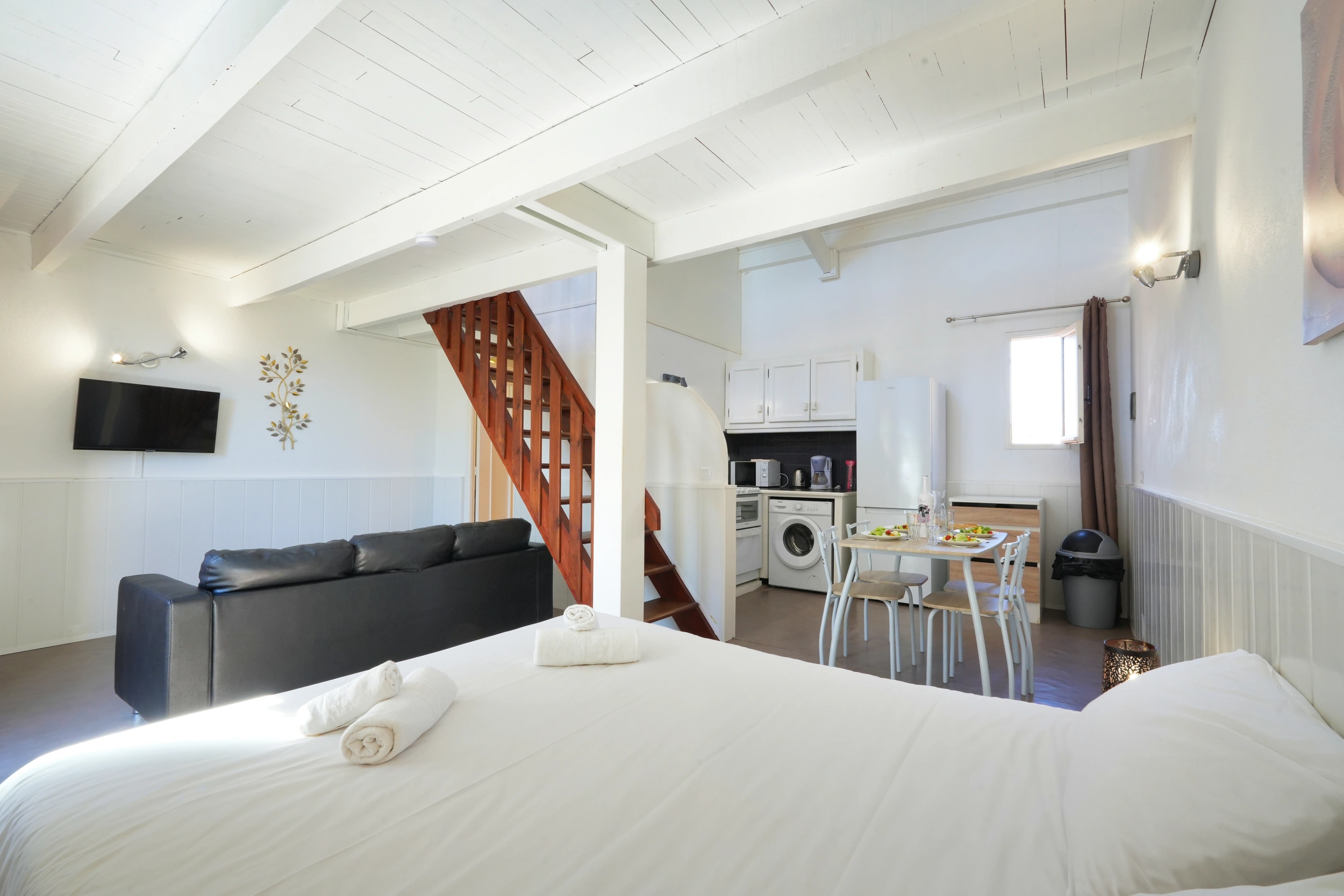 Conçu pour accueillir jusqu’à 4 personnes, le studio « Mezzanine » séduit par son agencement astucieux. À la pièce principale (1 lit 160 ou deux lits 90) s’ajoute une mezzanine aménagée (1 lit 160 ou 2 lits 90), idéale pour deux couchages supplémentaires. Avec ses 30 m² environ, il allie convivialité et confort. Parfait pour les familles ou les petits groupes, il est équipé d’une cuisine complète, climatisation, télévision, wifi et coffre-fort. Terrasse ou balcon selon le niveau, certains offrant une vue sur la mer.